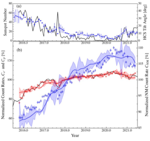 図: (a)太陽黒点数(黒線)と惑星間空間磁場のカレントシートの傾き角(青点)。(b) CALETで観測された平均リジディティ3.8ギガ電子ボルトの宇宙線電子(青丸)と陽子(赤丸)の計数率と、Oule stationにおける中性子モニターの計数率(黒線)。青線と赤線はドリフト効果を考慮した太陽変調モデルによる計算結果。いずれも全期間の計数率の平均値で規格化している。
